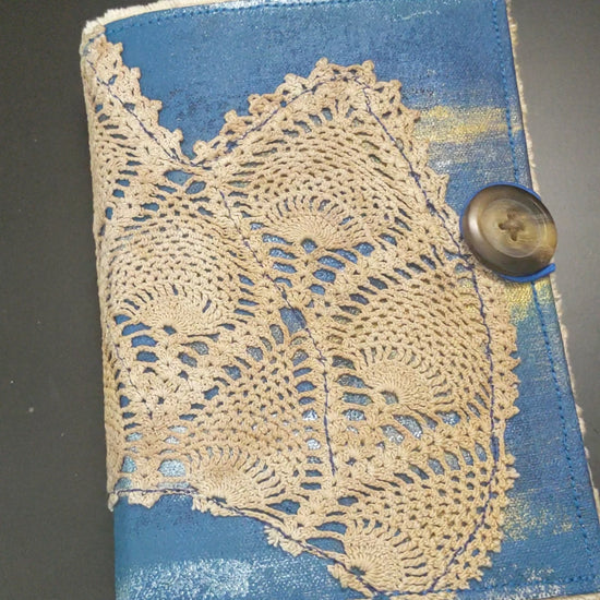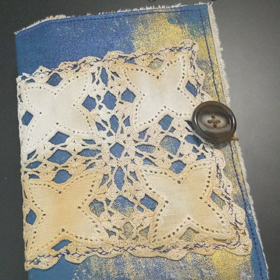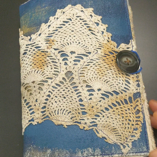 Filled with an array of dyed papers, stamping, stickers, vintage images and ephemera. Hand-painted canvas cover with upcycled packaging and coffee- and rust-dyed fabric, button closure.